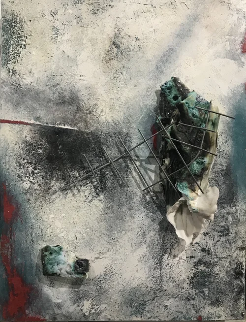 Oil and cold wax, slip-cast porcelain, crater glaze, rusted metal, sand and annealed steel wire on panel, 24 x 20 ”, 2018