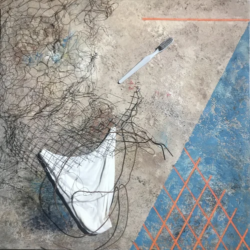 Oil and cold wax, slip-cast porcelain, wire fence, steel wire, toothbrush on panel, 20 x 20 ”, 2020