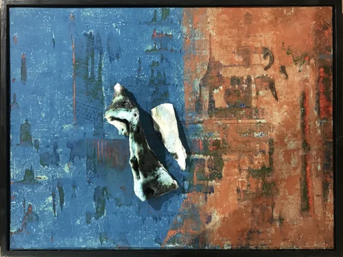 Oil and cold wax on artboard, slip-cast porcelain, parchment paper, rusted metal, painted frame, 20 x 17 x 1.5”, 2020