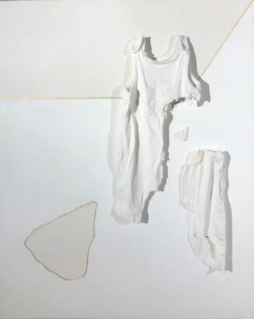 Slip cast porcelain, oil and cold wax, Kintsugi gold on panel, 30 x 24”, 2020