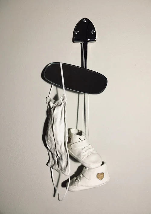Slip-cast porcelain, gold lustre, twilltape; mounted on 1964 VW rearview mirror,