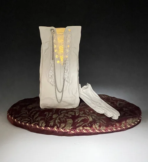 Modified Slip-cast porcelain bag, porcelain reflector with battery operated LEDs, lace, ring studs with silver chain sitting on a hand-sewn reconstructed vintage pillow.